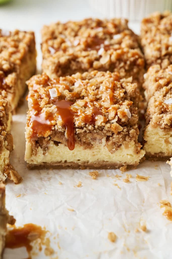 Caramel Apple Cheesecake Bars are the perfect Thanksgiving dessert recipe! Featuring a shortbread crust, spiced apple cheesecake layer, streusel topping, and caramel sauce… they’re pure decadence. Bake and cool the cheesecake, then drizzle with caramel before serving!