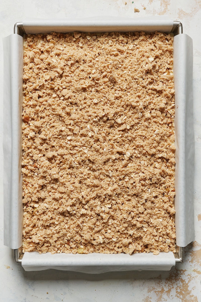 - Press the remaining crust mixture evenly into the bottom of the prepared baking pan. If you have a hard time pressing it into the pan, you can use a spoon.