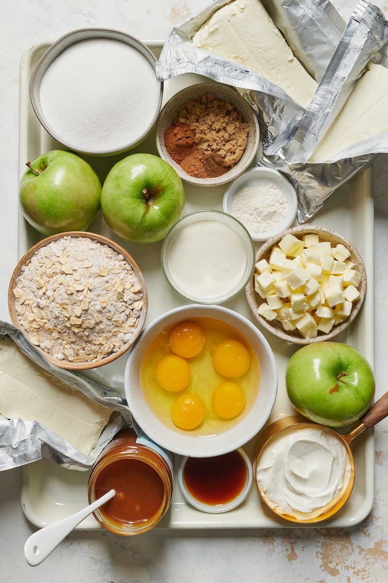 - Sugar: You’ll use granulated sugar in the creamy cheesecake batter, and light brown sugar for the spiced apples.