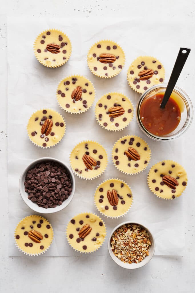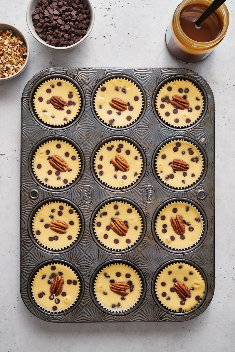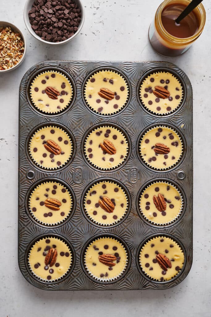 - Add the Batter to the Pan: Divide the cheesecake batter evenly among the prepared cups. Top each mini cheesecake with a pecan and a few mini chocolate chips.