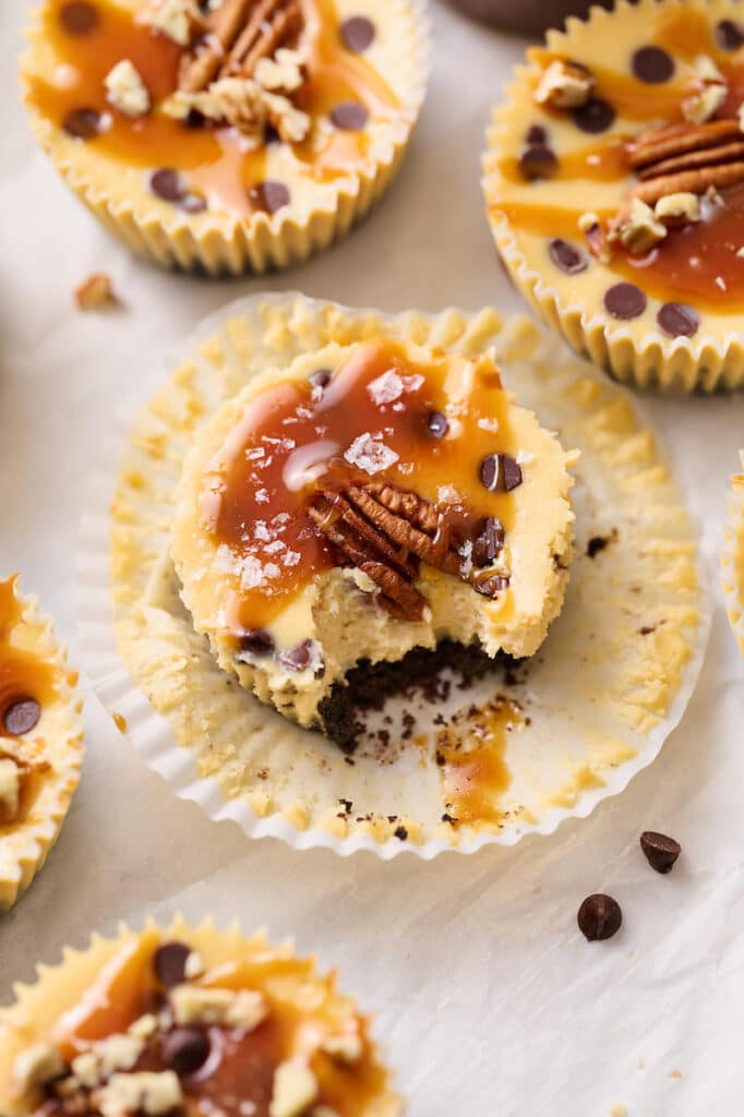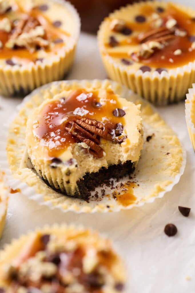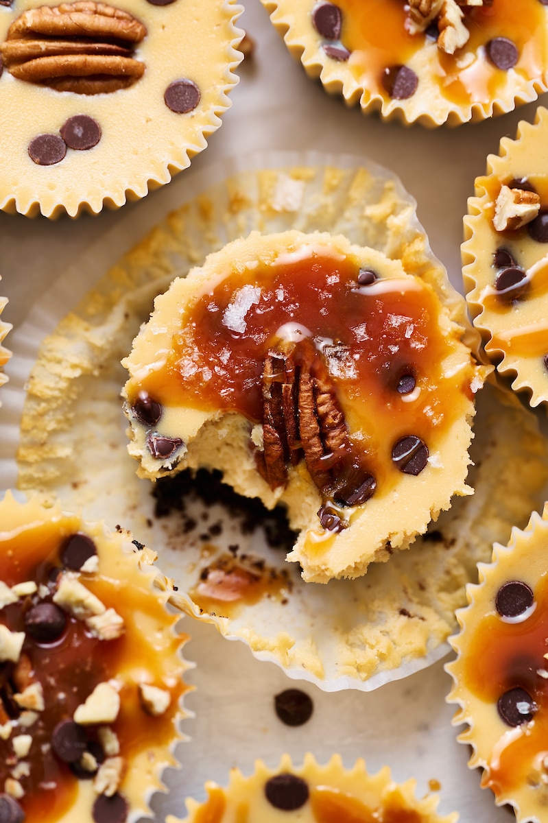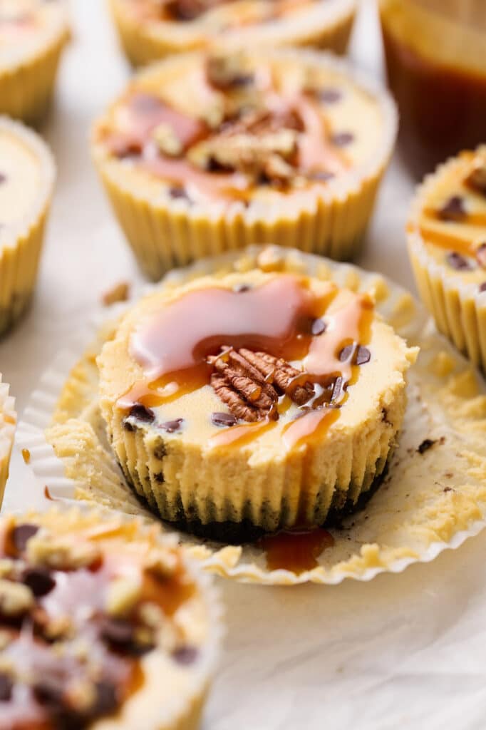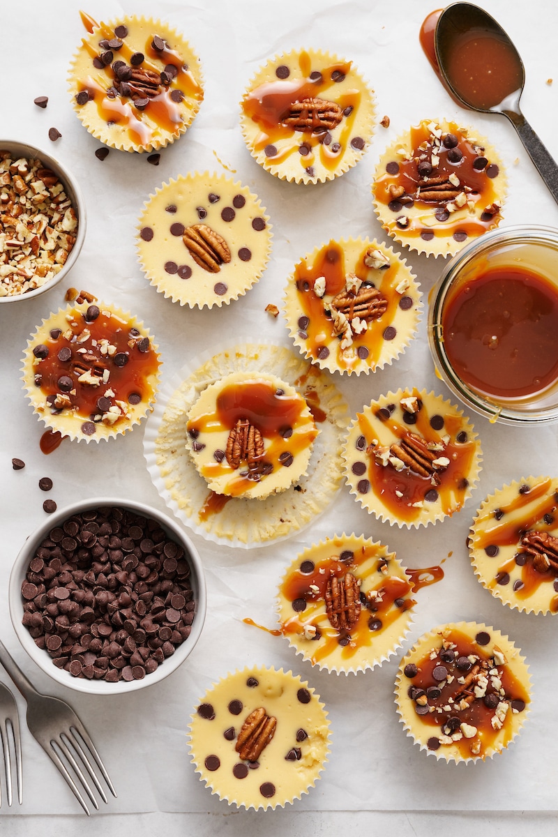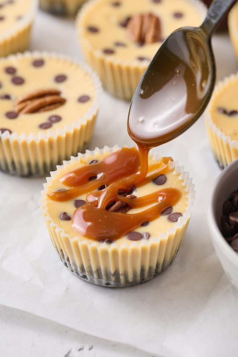 - Make them Pretty: Right before you plan on serving, go crazy with more garnish! Drizzle extra salted caramel sauce on top. And then sprinkle each mini with more chocolate chips and chopped pecans. For a salty kick, add a sprinkle of sea salt.