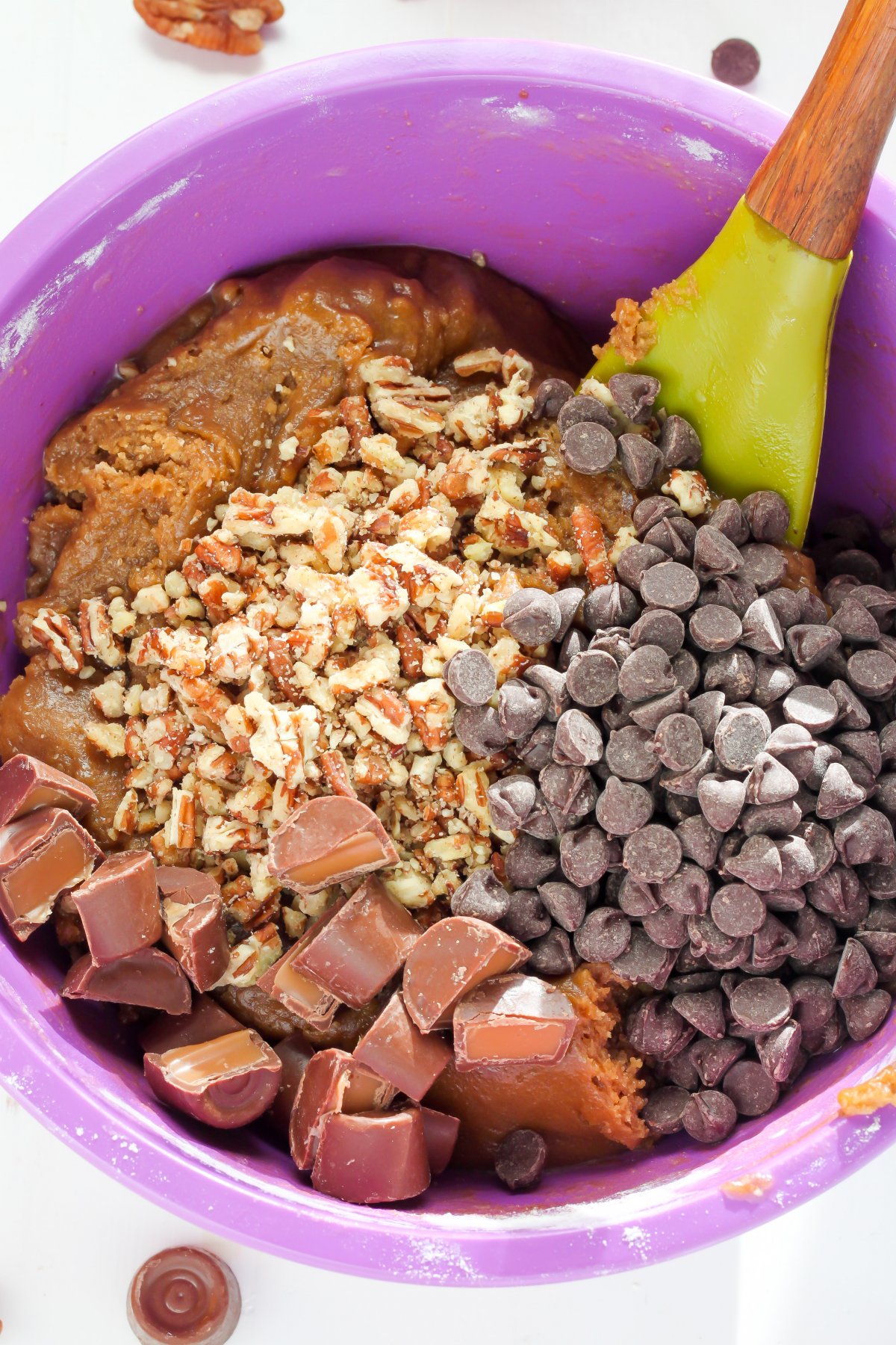 This was a huge family hit! I added a teaspoon of cinnamon (if I were to make it again I’d change this to half a teaspoon), I also added 1/4 cup of Bailey’s Irish Creme after I mixed the butter and the brown sugar. Instead of rolos I used Dove caramel chocolate (the single pieces wrapped in foil. I cut some in half and in fourths.) I would also recommend adding in more pecans than suggested if you’re a big fan on crunchy texture and nuts. I used a 60% coaco chocolate bar. I tossed all the mix-ins with a small bit of flour to keep it all from sinking.