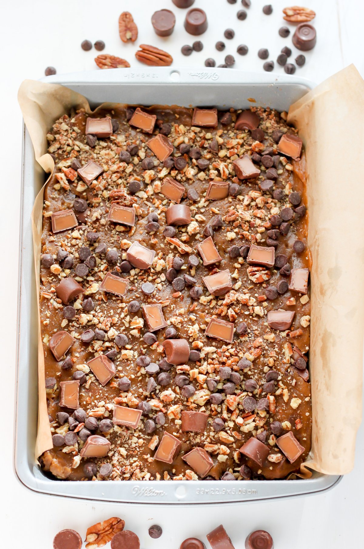 - Spread the mixture evenly in the pan, then sprinkle the top with remaining chocolate chips, rolos, and pecans. Bake the blondies for 18 minutes, then cover the pan with aluminum foil and bake for another 15 minutes, or until they're light brown on the edges and top. Carefully remove them from the oven and cool completely before cutting.