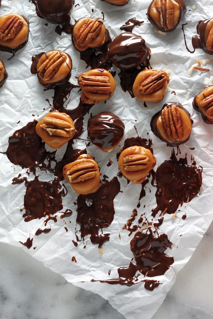 - Gently press a toasted pecan half onto each caramel; set aside and cool completely.