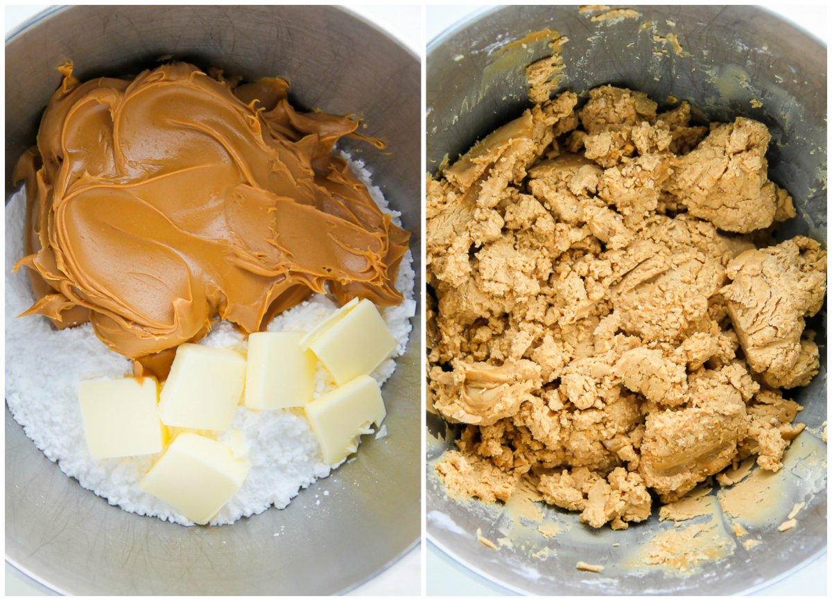 To make the simple peanut butter filling, you’ll combine the powdered sugar, peanut butter, vanilla and softened butter in a large bowl and beat it on low-speed until the mixture is slightly crumbly. Then you’ll add milk, one tablespoon at a time, and continue to beat until the mixture becomes a workable dough. It will be a little sticky and kind of feel like play-doh.