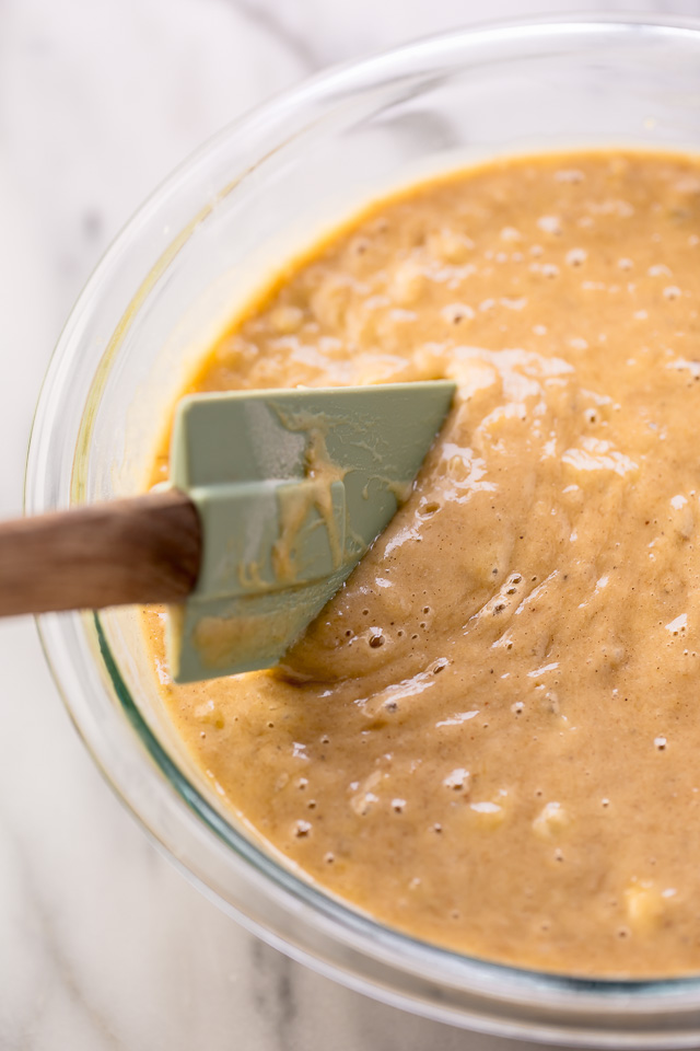- In a separate large bowl, whisk together the mashed bananas, sugars, sour cream, and oil. Whisk in eggs and yolk, one at a time. Then add the dry ingredients to the wet, mixing only until combined. Don’t overmix!