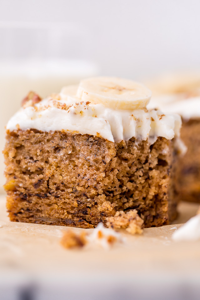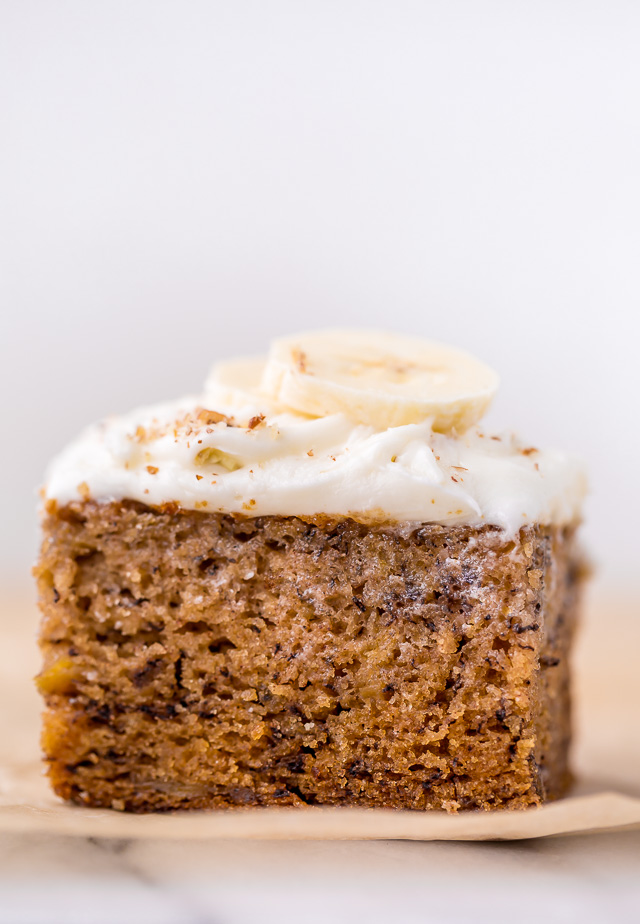 One thing I ALWAYS have on hand? Bananas! And more often than not, I have an overripe banana (or 10) that’s just begging to become dessert! My current obsession? Banana Cake! It’s moist, dense, and perfectly sweet. And since it’s baked in a sheet pan, it’s MUCH easier than a layer cake.