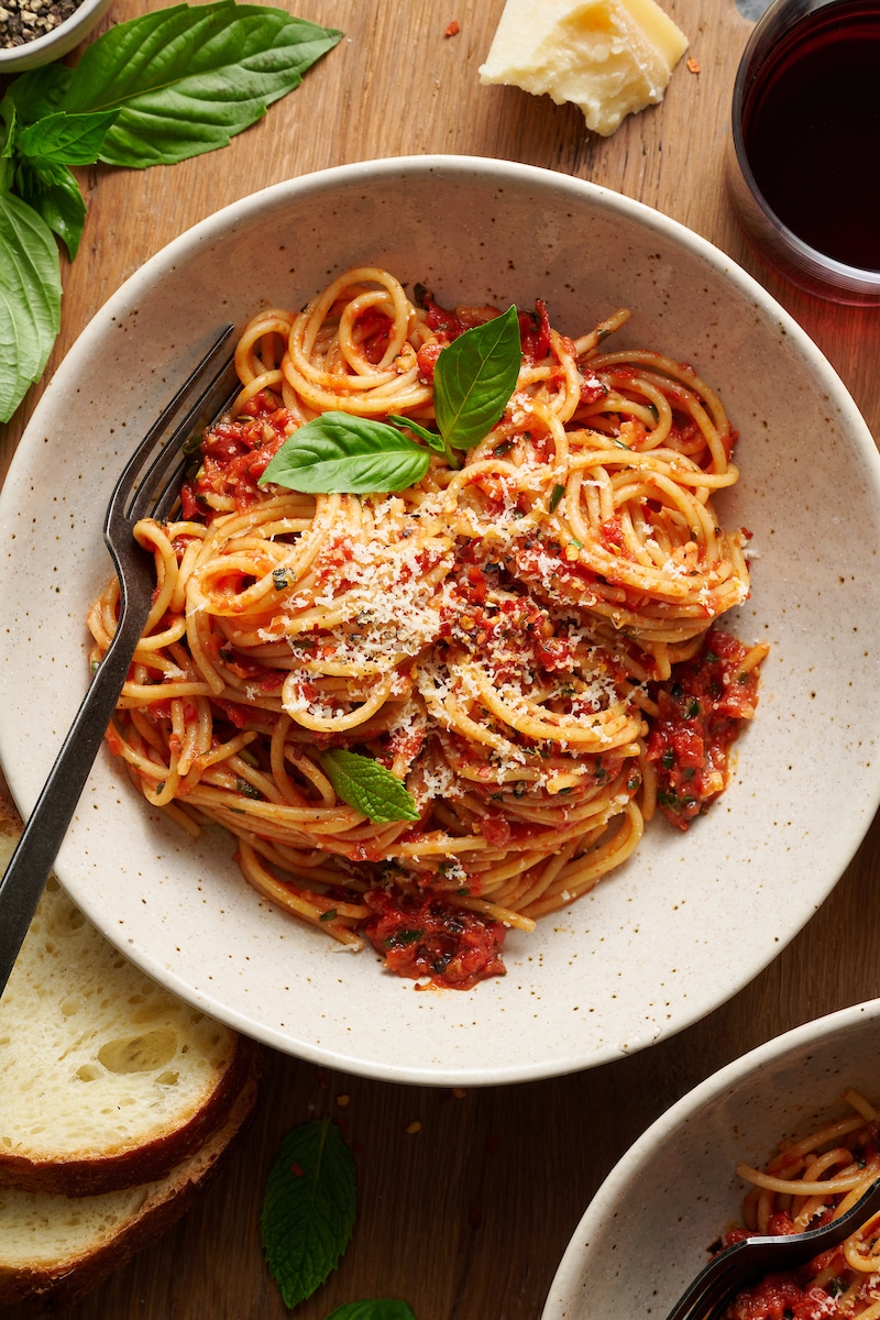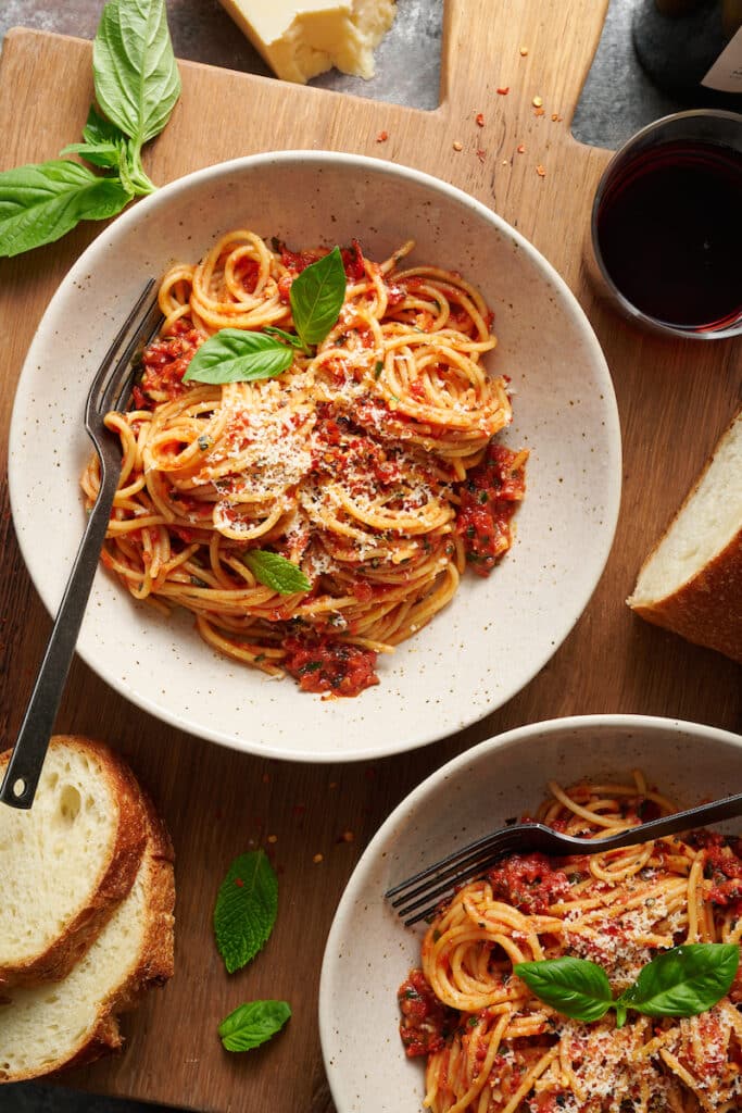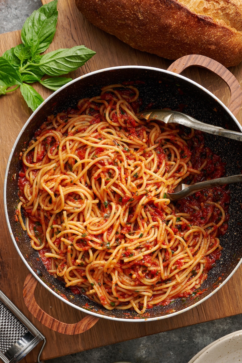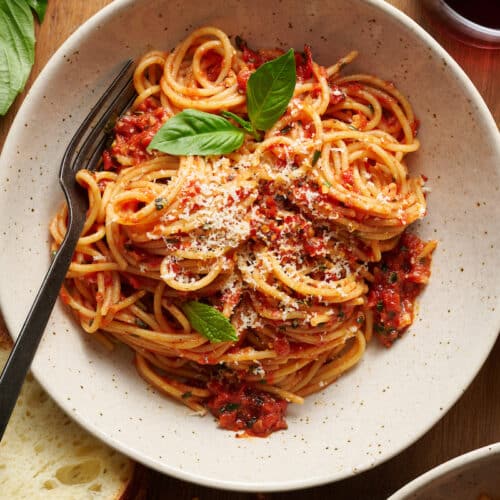 A classic Italian pasta, this spaghetti fra diavolo is quick, easy, and delivers tons of flavor. The homemade spaghetti sauce comes together fast, making it a great weeknight recipe. Served with garlic bread, a simple salad, and red wine, this spaghetti recipe is sure to earn a place in your dinner routine.