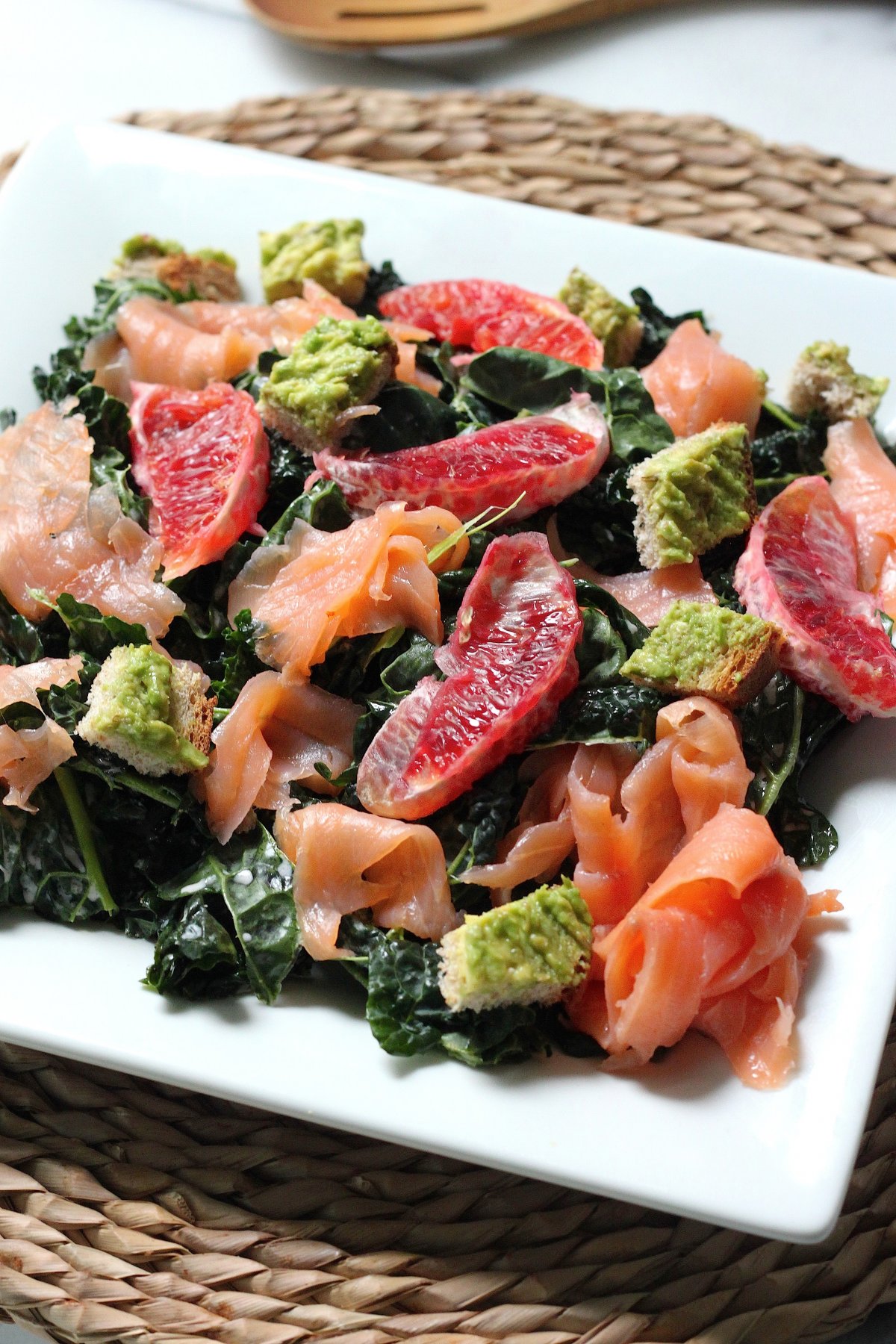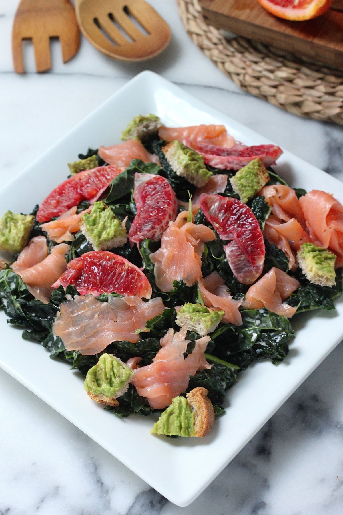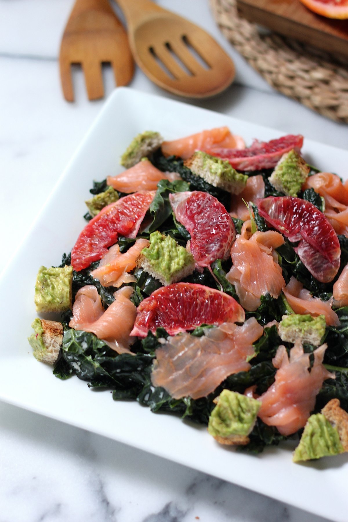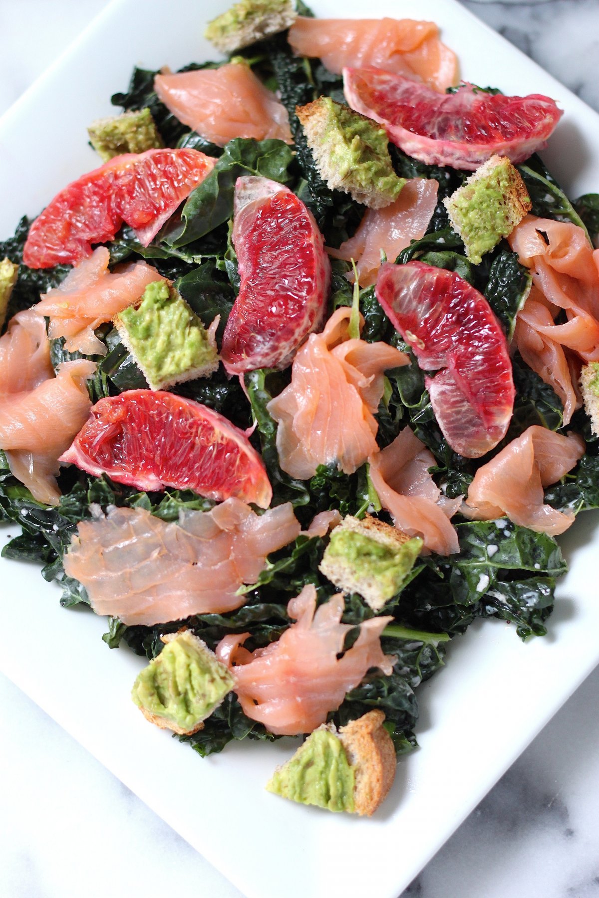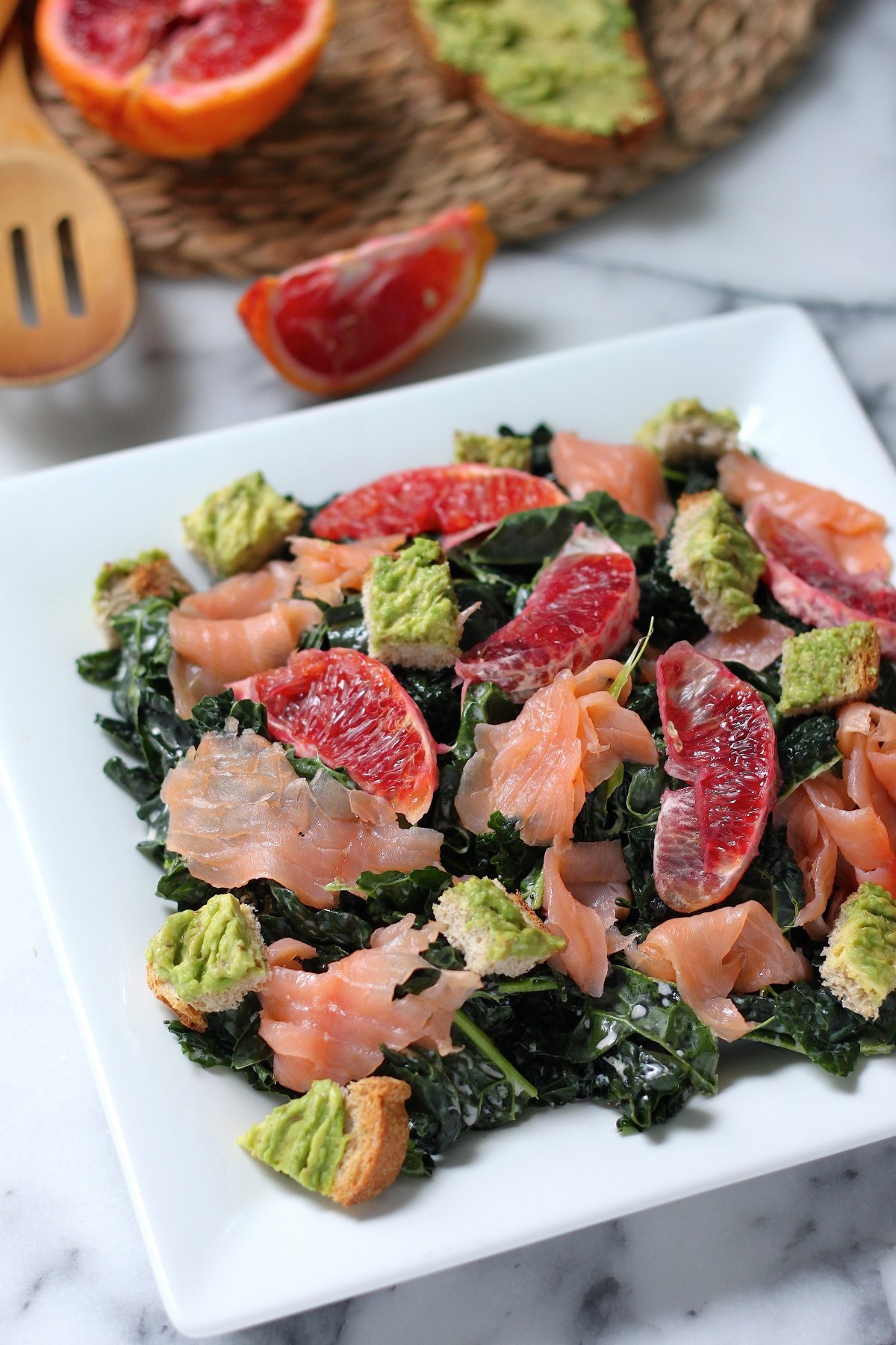 This vibrant kale salad just swims with flavor thanks to briny smoked salmon, sweet blood orange segments, and crunchy/creamy avocado toast croutons.