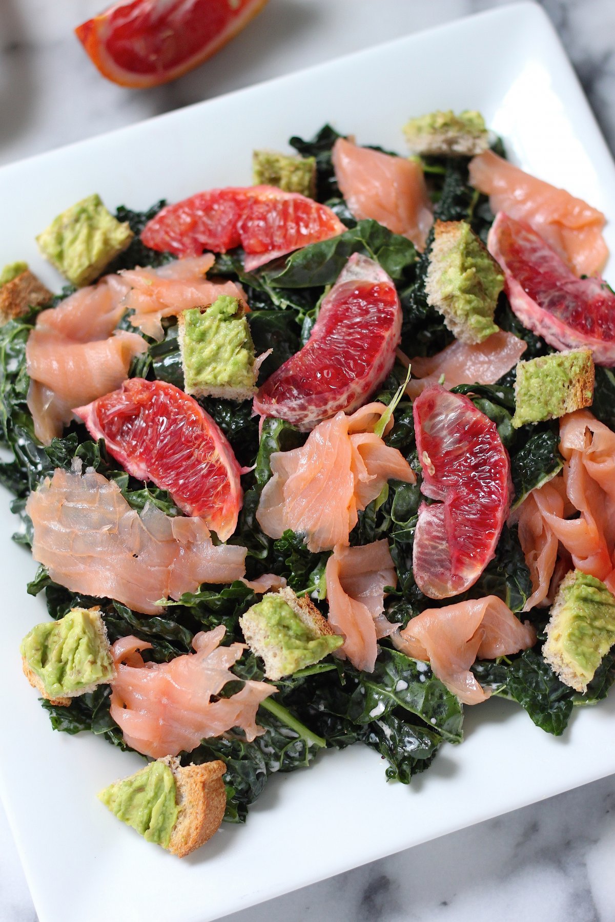 Smoked Salmon and Blood Orange Kale Salad with Avocado Toast Croutons