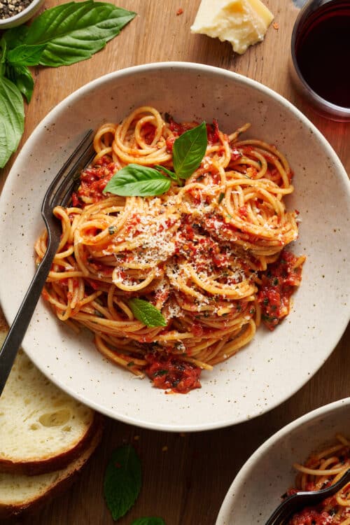 Once your pesto is whipped up and ready to go, all you need is some al dente  spaghetti, and you’re set! Of course wine and cheese are always welcome 😉 xoxo