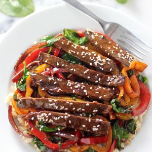 You guys know I love a 30-Minute Meal (have you tried my Healthy 30 Minute Sriracha Teriyaki Meatball Bowls? Or this 30-Minute Sriracha Chicken and Broccoli Lo mein? These 30-Minute Mozzarella Stuffed Turkey Meatballs with Homemade Marinara are a must!), and this pepper steak is definitely at the top of my favorite list! It’s loaded with flavor (think soy, ginger, sriracha, and garlic), and packed with a colorful bounty of vegetables, so you can feel pretty darn good about every bite you take. Love that!