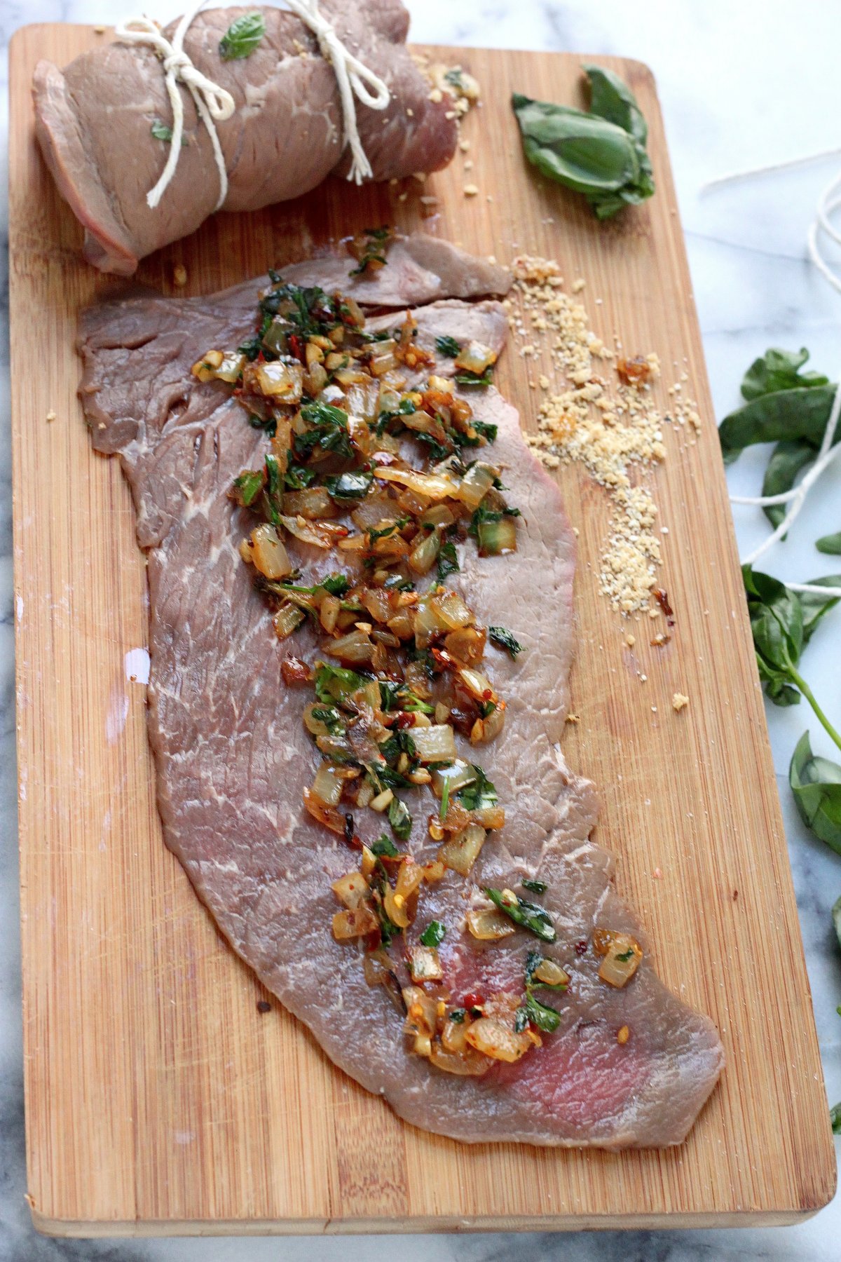- Lay the braciole flat on a large, clean work surface. Sprinkle the bread crumb/onion mixture evenly over the steak to cover the top evenly (if you're using multiple pieces of meat, divide the filling accordingly). Starting at 1 short end, and roll up the steak "jelly roll style" to enclose the filling completely. Using butcher's twine, tie the steak roll at the beginning, middle, and end to secure. Sprinkle both sides of the braciole with salt and pepper.