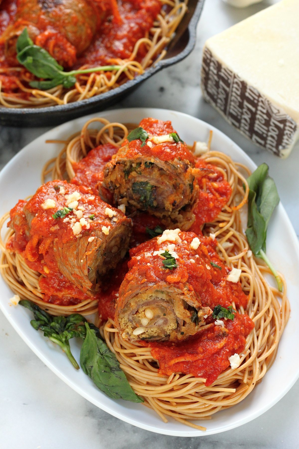Toss a roll or two (or three) on top of spaghetti, cover it in cheese and fresh basil, and serve at once! Just get ready for the wave of applause and “oh hey, can I get this recipe?” requests, because they will be a comin’ your way! Sicilian Braciole is just that much of a hit 😉