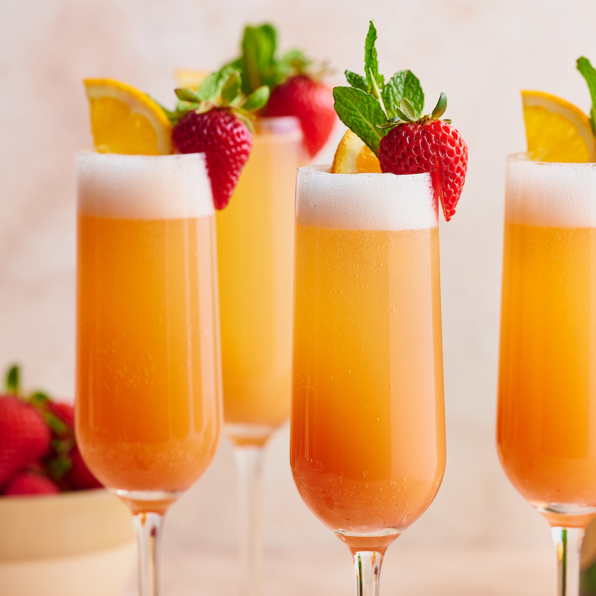 - Place a small strawberry and slice of orange on the rim of each glass and garnish with a sprig of mint. Repeat with all glasses. (Makes about 6 mimosas).