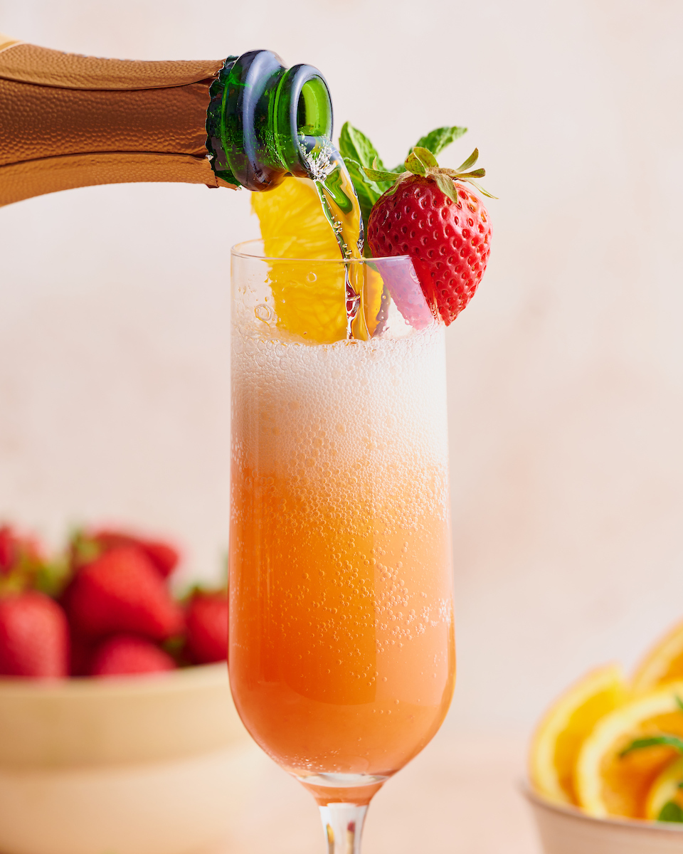 Everyone knows how to make a classic mimosa; it’s literally equal parts sparkling wine and orange juice. So let’s make my sunrise strawberry mimosa recipe instead! Made with strawberry puree, champagne, grand marnier, and fresh squeezed oj, they’re heaven in a champagne flute. Garnished with fresh fruit, they’re the perfect brunch cocktail!