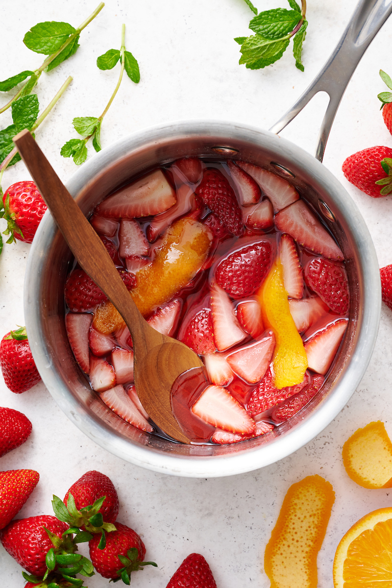 - You’ll need strawberries, orange peel, a sprig of mint, sugar, and water.