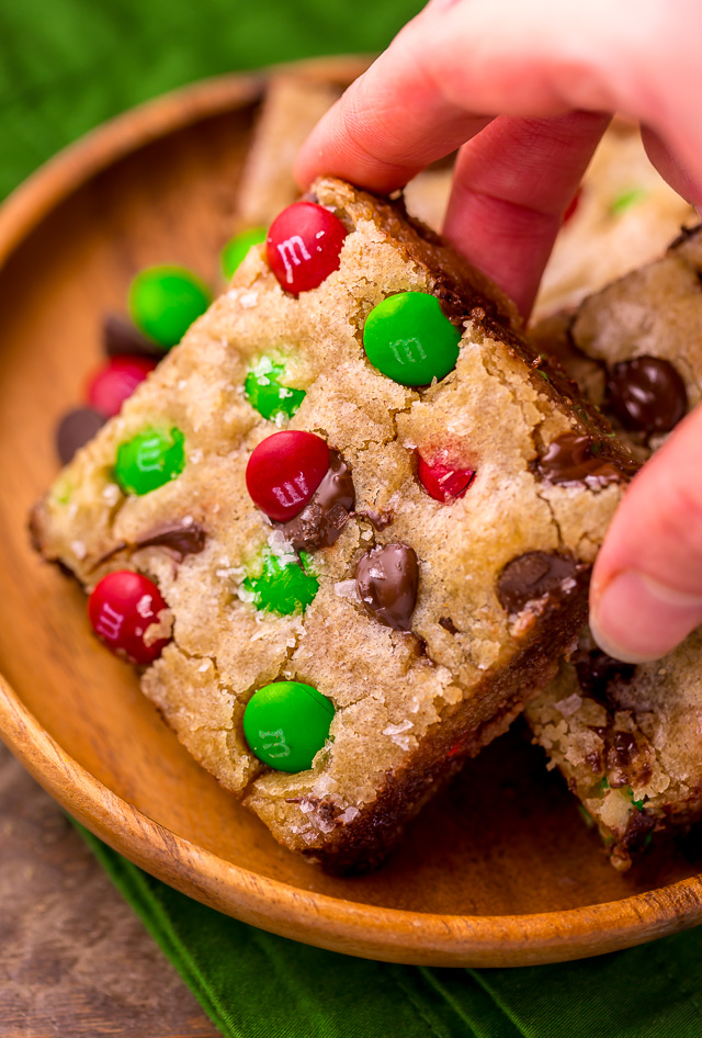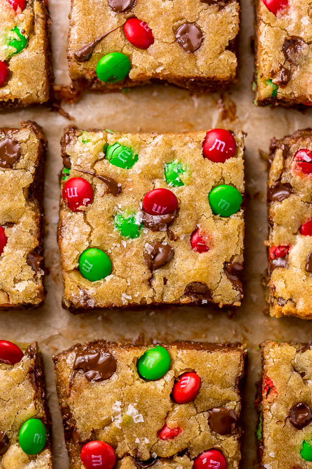 And today, we’re kicking the series off with these Holiday M&M Blondies! They’re fun, festive, and so easy! Even the most novice baker can make this recipe!