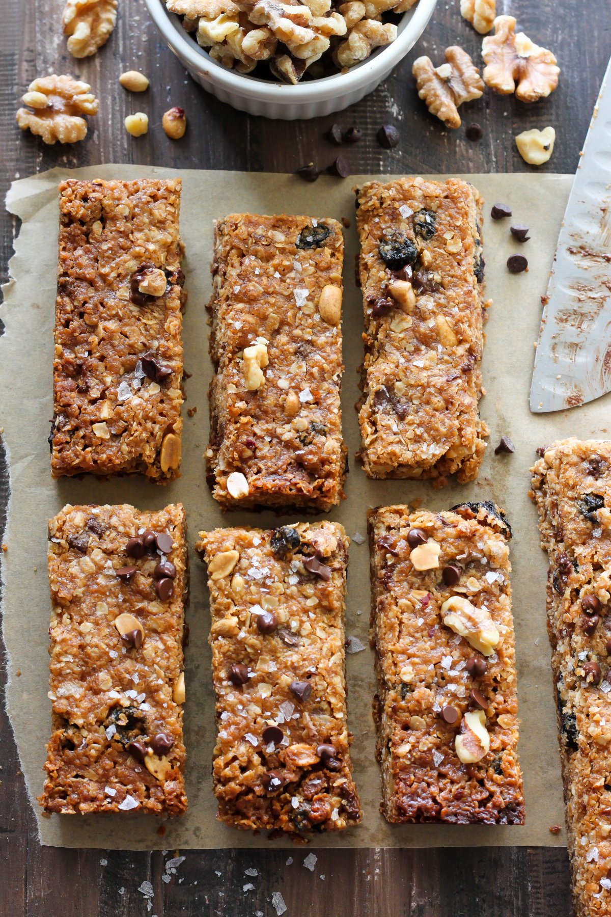 Thick and chewy, these Sweet and Salty Chocolate Peanut Butter Granola Bars are full of flavor and exploding with mini chocolate chips and mixed nuts! Here’s the recipe for my perfect granola bars.