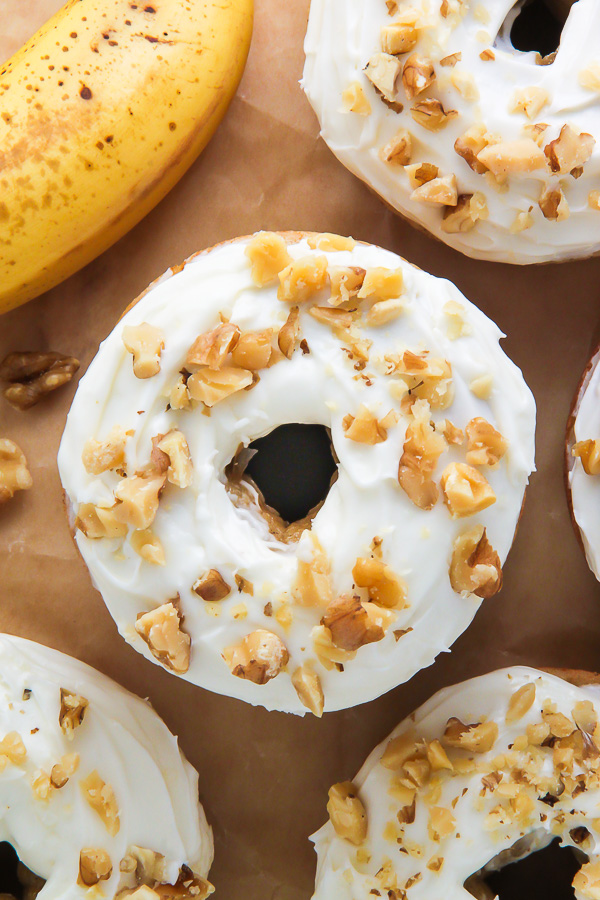 Supremely moist and flavorful banana bread donuts topped with luscious cream cheese frosting! Add a sprinkle of chopped walnuts for a lovely little crunch.