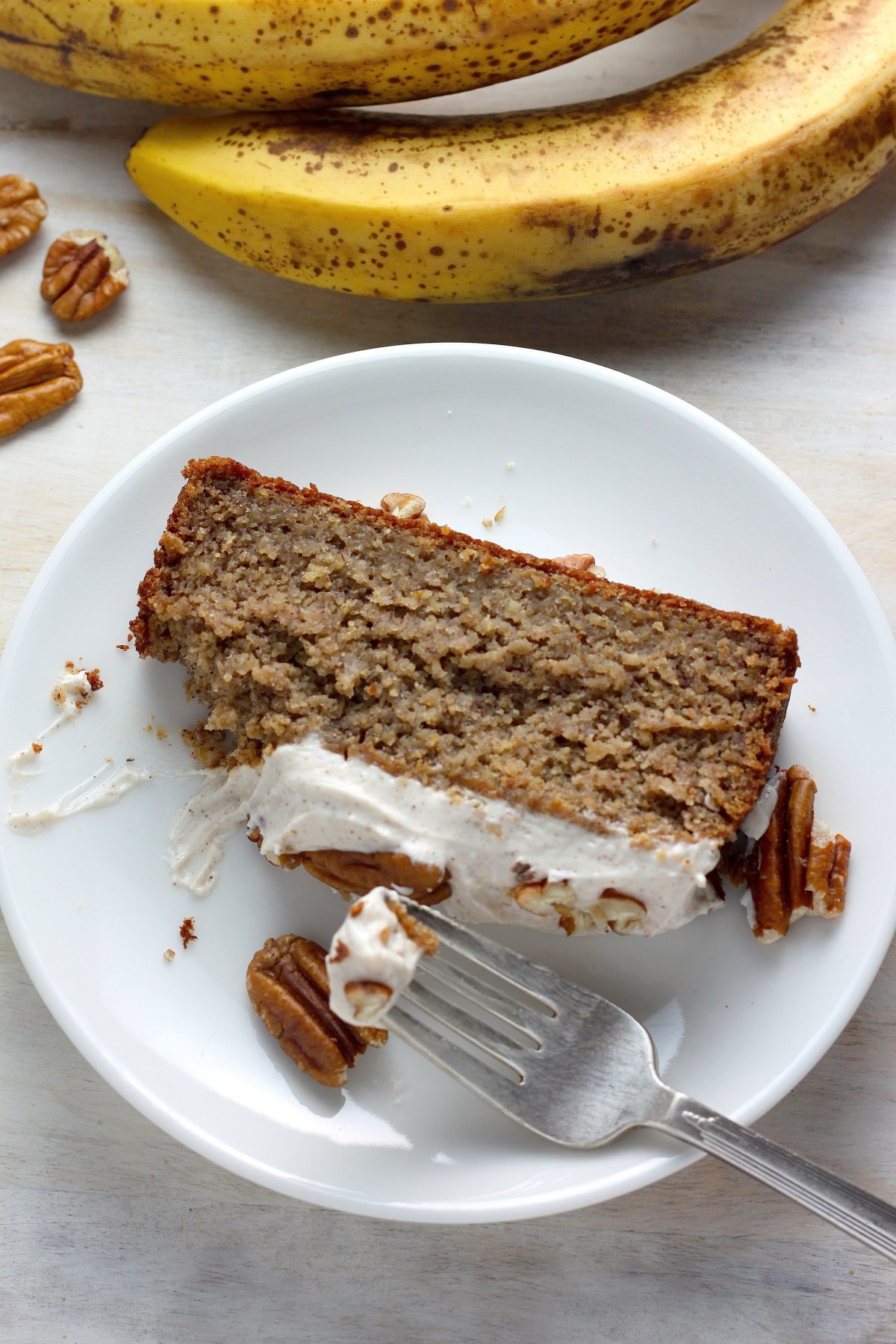 Tender and moist homemade banana bread topped with a light Greek yogurt frosting that’s sweetened with cinnamon and just a touch of maple syrup… this skinny banana cake is a truly delightful treat morning, noon, or night!