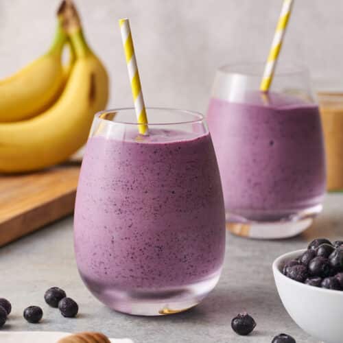 This easy blueberry smoothie recipe gets its creamy texture from frozen blueberries, frozen banana, and almond butter! Ready in just minutes, you simply toss all of the ingredients into a blender and blend until smooth. Blueberry Smoothie Recipe I know this is a bold move, but I’m declaring this the BEST blueberry smoothie recipe ever!…