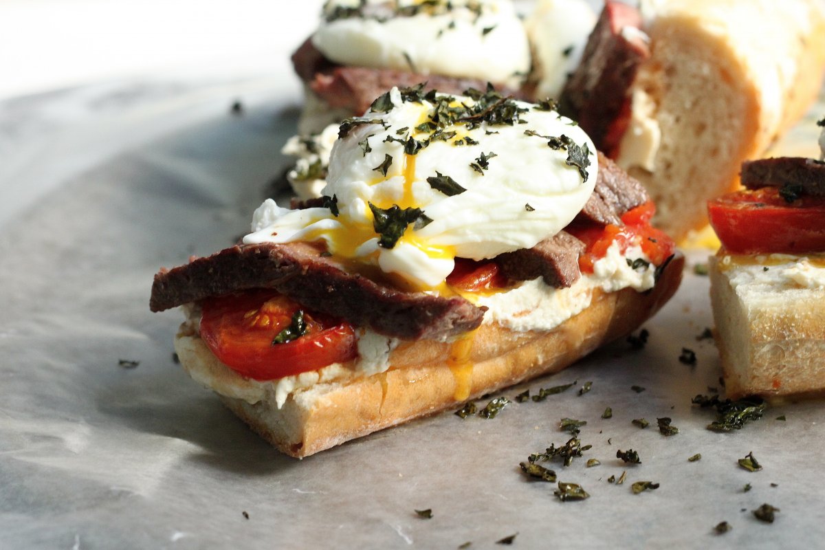 Steak and Egg Breakfast Bruschetta with Crispy Kale, Goat Cheese, and Roasted Tomatoes