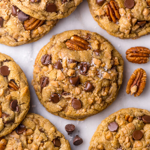 The only thing better than a chocolate chip cookie? A brown butter chocolate chip cookie that’s loaded with toffee pieces, toasted pecans, and a touch of cinnamon. Trust me, once you try these brown butter toffee cookies, you’ll never want to use another recipe again! Brown Butter Toffee Chocolate Chip Cookies If you follow me…