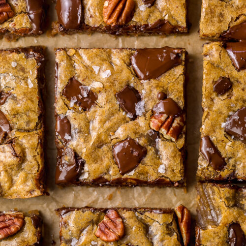 Brown Butter Bourbon Pecan Chocolate Chunk Blondies are chewy, crunchy, and loaded with gooey pockets of chocolate! The bourbon gives them a subtle kick without being overpowering! This easy and crowd-pleasing dessert recipe is perfect for holiday parties! And don’t worry about the bourbon getting you tipsy… it’s only a small amount and cooks out…