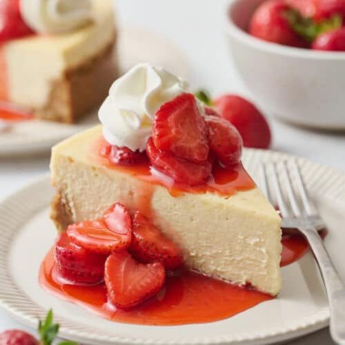 New York-Style Cheesecake is rich, creamy, and one of the most famous cheesecake recipes in the world! With a crunchy graham cracker crust and dense but creamy cheesecake filling, it’s delicious with strawberry sauce on top! Follow my pro-tips below to prevent cracking while the cheesecake bakes. New York Cheesecake? Yes, Please! Reader Sheri F. says:…
