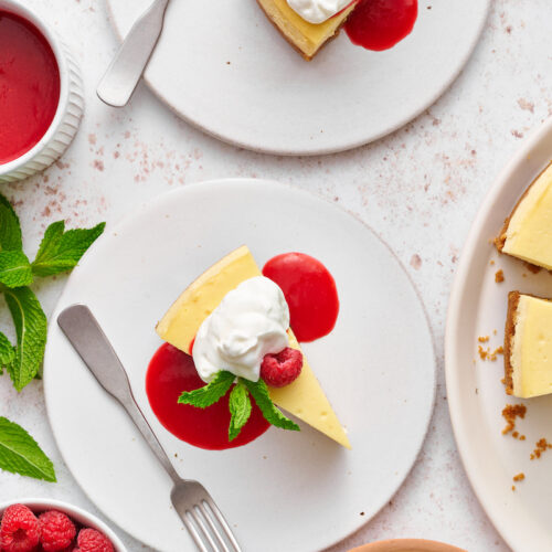 This stunning lemon ginger cheesecake is rich, creamy, and silky smooth! Made with fresh ginger, lemon juice, and lemon zest, it’s bursting with fresh flavor. The hot pink raspberry sauce makes it a total showstopper! Lemon Ginger Cheesecake Spring is in the air and you know what that means – time for ALL the lemon…