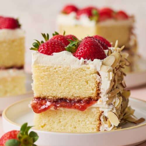 This stunning Strawberry Pound Cake recipe features a buttery almond pound cake that’s covered in fluffy white chocolate buttercream. A swirl of strawberry jam, fresh strawberries, and sliced almonds make it a total showstopper! This cake requires some patience with the assembly, but is totally worth the effort. How Pretty is this Strawberry Cake? I…