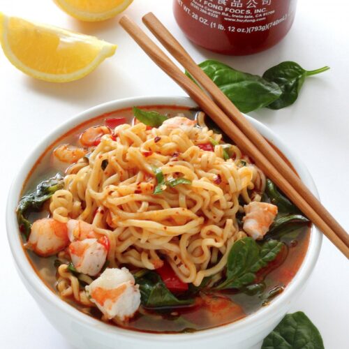 This 20-Minute Sriracha Shrimp Ramen is so easy and delicious! A flavorful ramen noodle soup recipe the whole family will love! Shrimp Ramen Ramen is at the top of my list of favorite foods to eat in the Winter. It’s fast, flavorful, moderately healthy, and fantastically filling. Each slurpy bite warming both belly and soul….