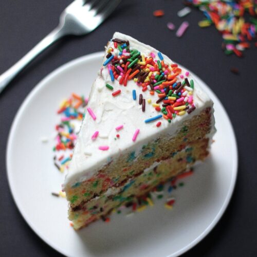 Exploding with rainbow sprinkles, this super moist funfetti cake recipe is perfect birthday cake! The vanilla cake layers are heavenly moist and fluffy… and feature colorful sprinkles in every-single-bite. We top this colorful cake with classic cream cheese frosting and extra sprinkles. Jump to the recipe card for the full recipe and recipe video! Funfetti…