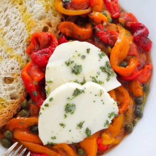 Flavorful roasted peppers are tossed with capers and fresh mozzarella – the perfect Summer salad!