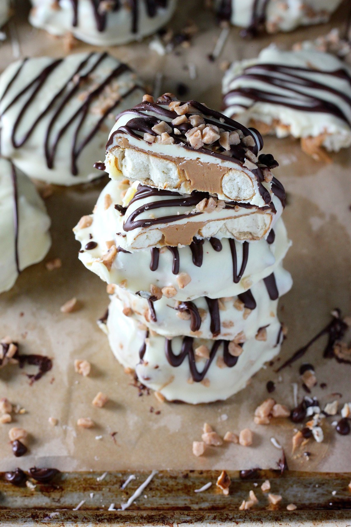 Hello friends! I made us more homemade treats! Giant crunchy pretzels stuffed with creamy peanut butter, dipped in white chocolate; drizzled in dark, and sprinkled with toffee >>> you gotta put these on your to-do list now! And when I say now, I mean like… right this instant! Just so we’re clear. These giant crunchy, creamy…