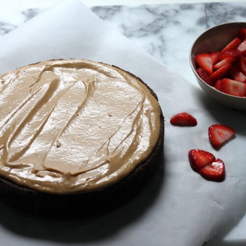 Dark Chocolate Cake with Peanut Butter Mousse and Macerated Strawberries