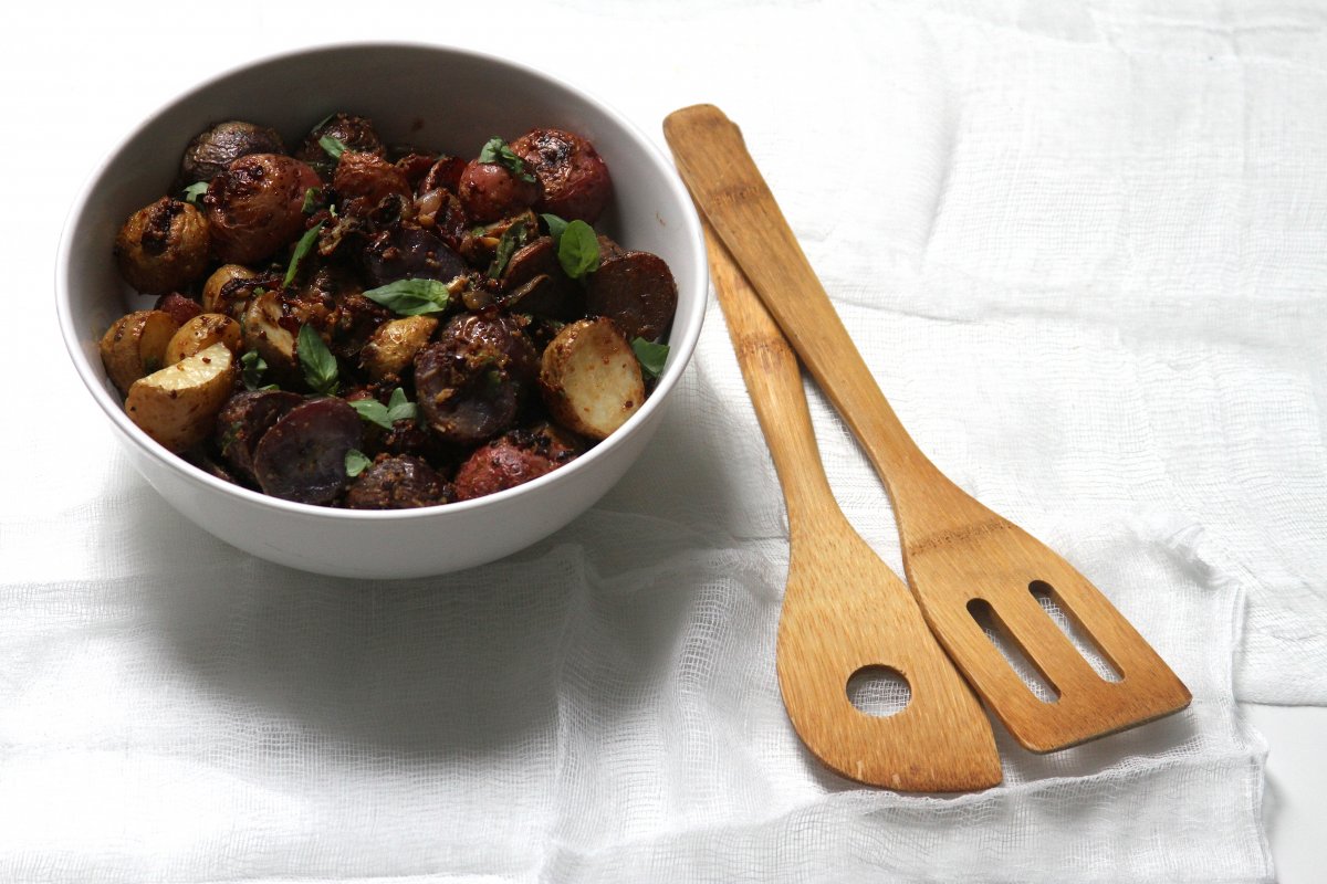 Mustard & Garlic Roasted Potatoes with Crispy Prosciutto, Shallots, and Fresh Basil Vinaigrette