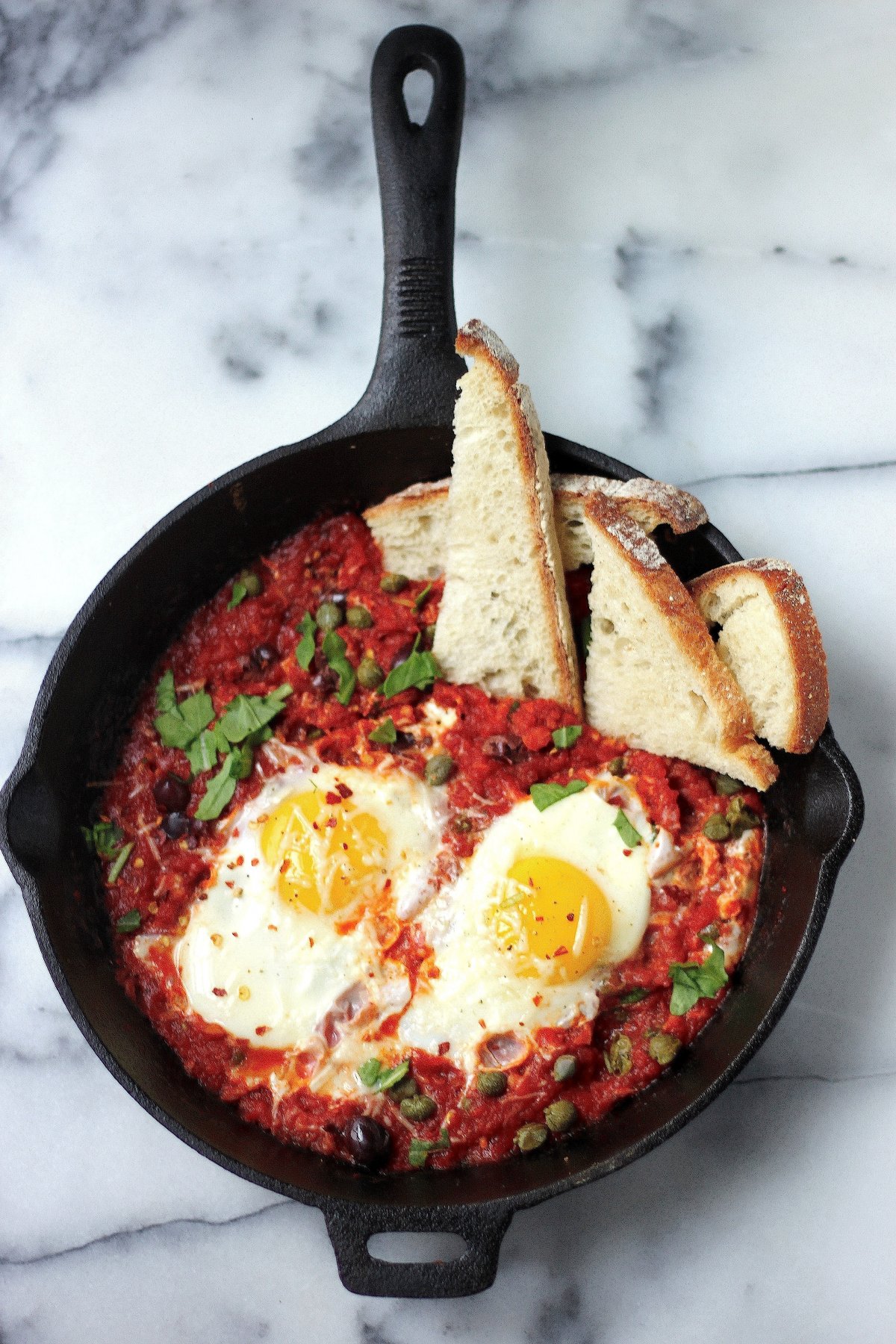 Happy Saturday! Let’s start this weekend off with spicy sauce and poached eggs… together! In one skillet. So simple. So spicy. So totally what your morning needs! Did I mention all this deliciousness happens within 20 minutes?! That’s love right there… <3<3<3 Be sure to have lots of bread on hand for dipping. Dipping is…