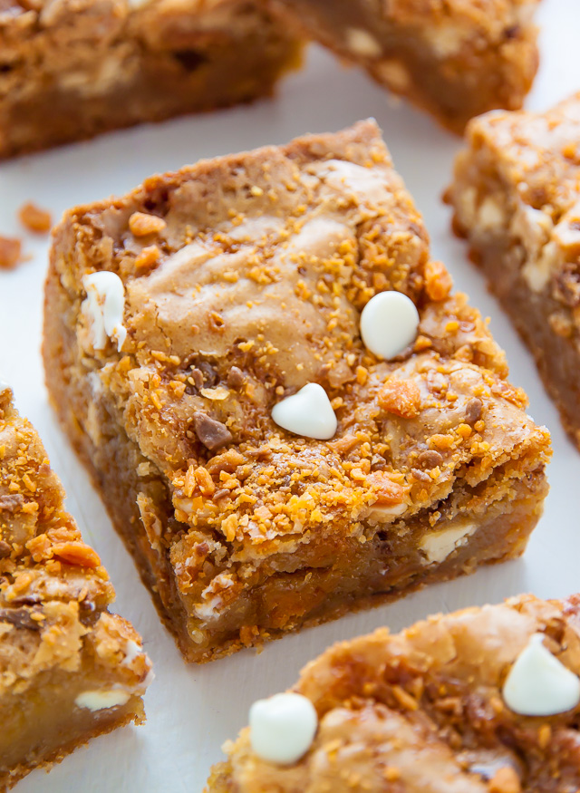 Chewy Butterfinger Blondies loaded with White Chocolate Chips! Easy, delicious, incredible.