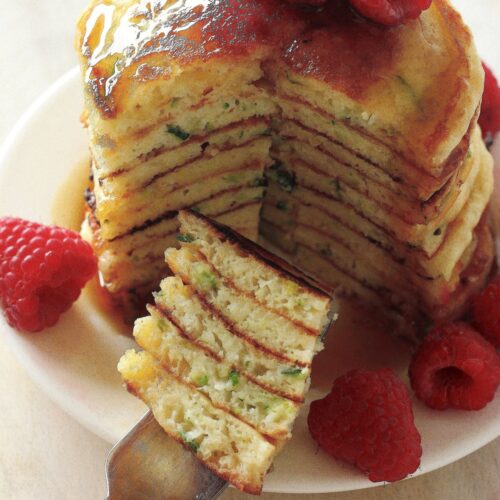 Healthy Greek yogurt zucchini pancakes so soft, sweet, and fluffy, you’ll want them for breakfast everyday! Top with fresh berries, a drizzle of honey, or good old fashioned maple syrup – no matter how you dress them up, this stack is sure to please any pancake lover 😉