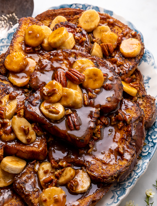 Between the brown sugar bananas foster sauce, caramelized bananas, and crunchy pecans, this recipe will leave you wondering: is this breakfast or dessert? I’ll let you decide the answer to that question! But if you decide on dessert, I suggest leaning into it by adding a few scoops of vanilla ice cream on top!