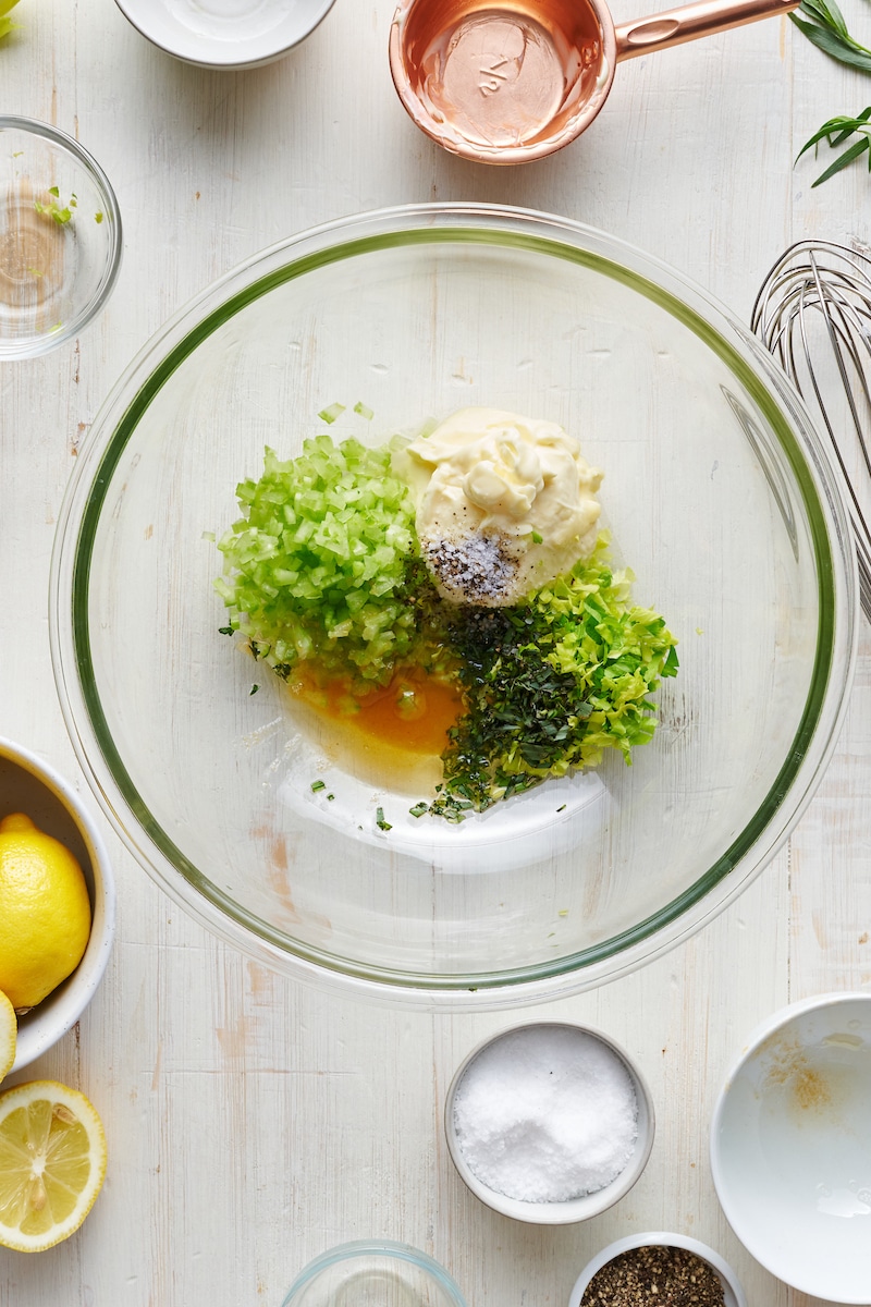 - In the meantime, whisk the mayonnaise, melted butter, celery leaves, lemon juice, tarragon, celery, salt, and pepper together in a large bowl. Set aside.