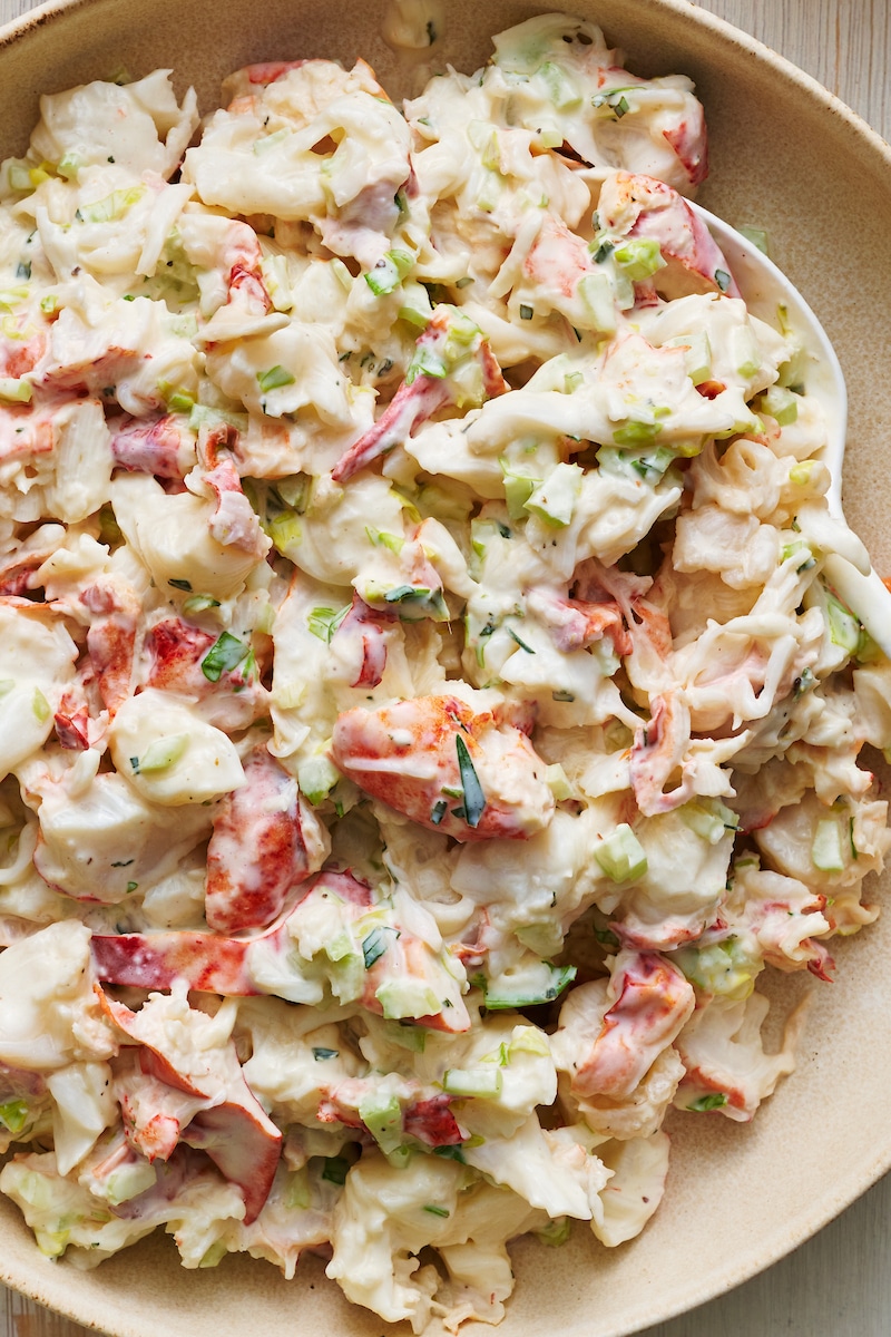 - Remove the lobster meat from the fridge and stir it into the remaining mayonnaise mixture, tossing well to evenly coat the meat in the sauce. Taste and add more salt and pepper if needed.