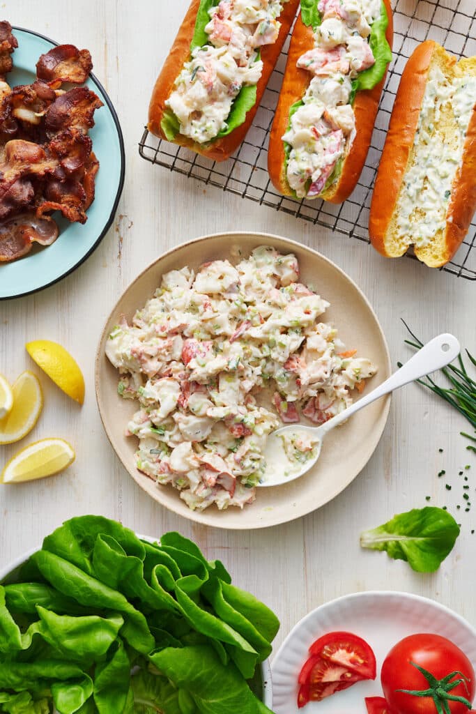 Inspired by the lobstah rolls I grew up eating on Nantucket and Cape Cod, but with a BLT twist! This recipe features split top buns and cold lobster salad, plus bacon, lettuce, and tomatoes. The BLT part is optional but it adds a summery twist everyone loves. These are summertime on a bun!