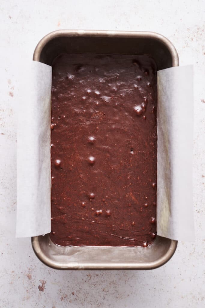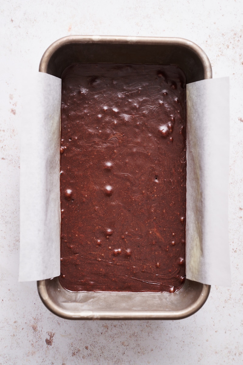 - Preheat the oven to 350 degrees (F). Line a 9×5-inch loaf pan with parchment paper. Spray lightly with non-stick baking spray and set aside.