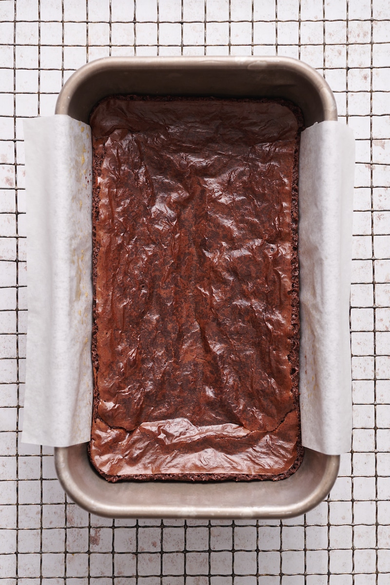 - Brownie Baking Prep: Preheat the oven to 350! Then line a 9×5-inch loaf pan with parchment paper. To ensure the brownies don’t stick, spray lightly with non-stick baking spray!