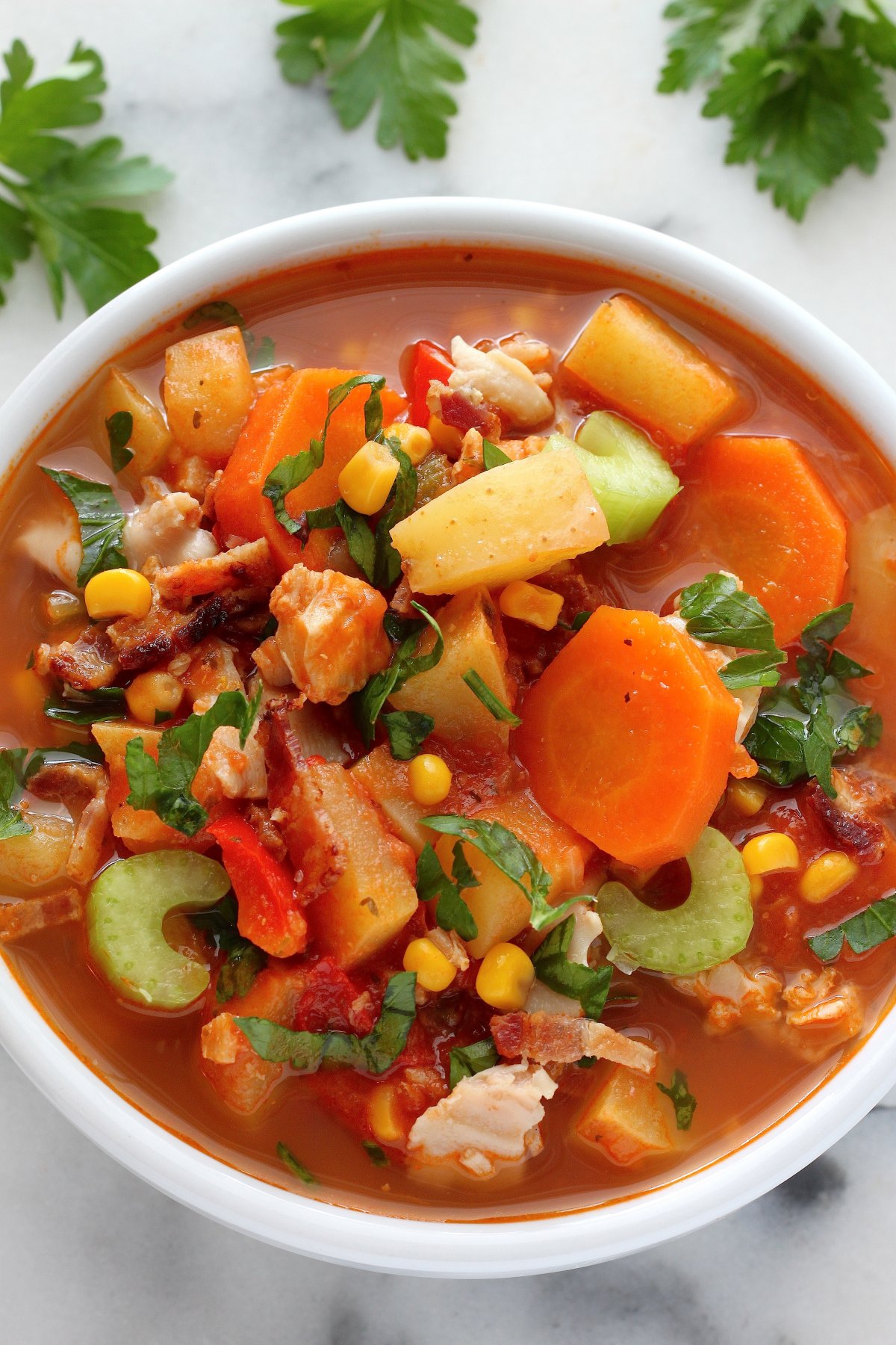 This is not your ordinary ho-hum pot of clam chowder. And it might not be quite what you envision when you think of clam chowder. Many are only familiar with the creamier version of this soup, known as New England Clam Chowder. This version is not creamy at all – but instead features a flavorful tomato base that’s loaded with potatoes, carrots, celery, corn, and of course, CLAMS! So delicious!