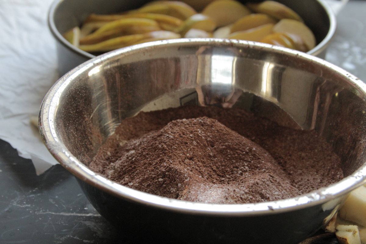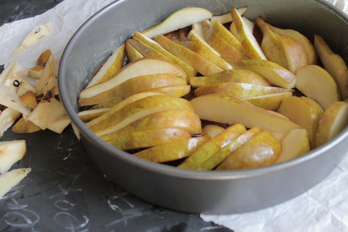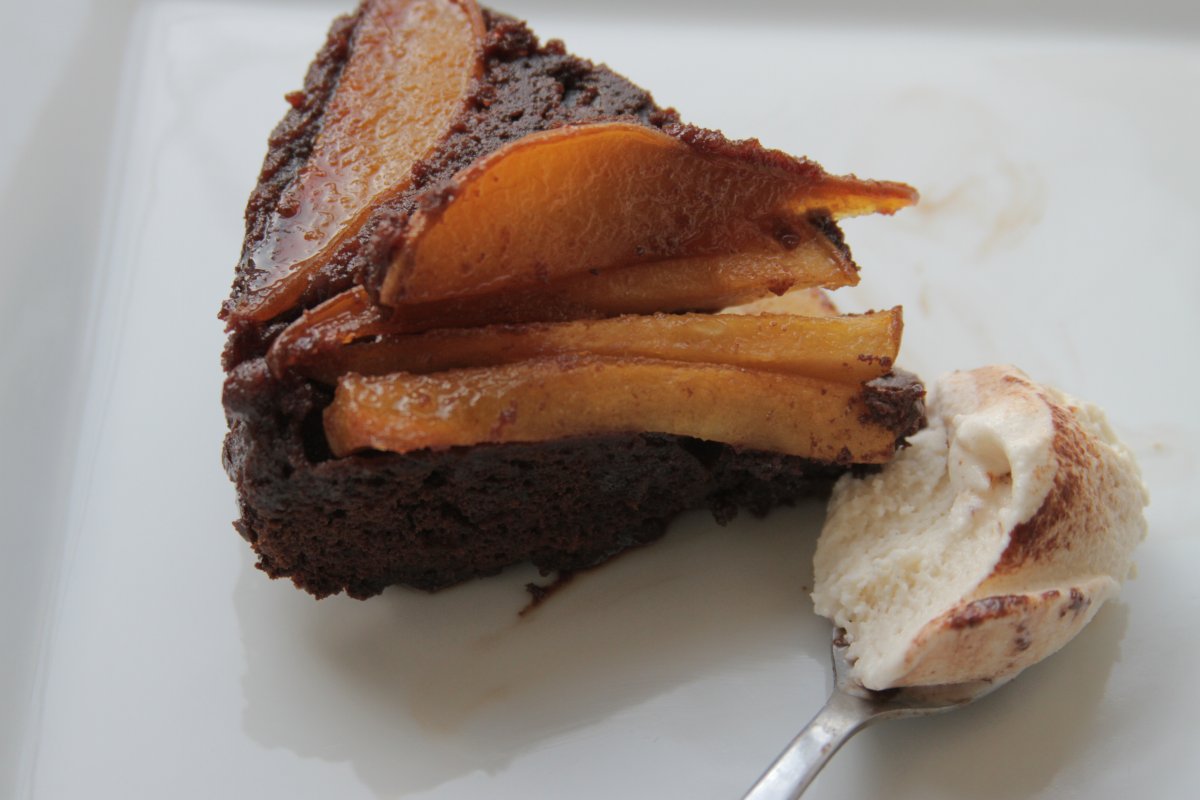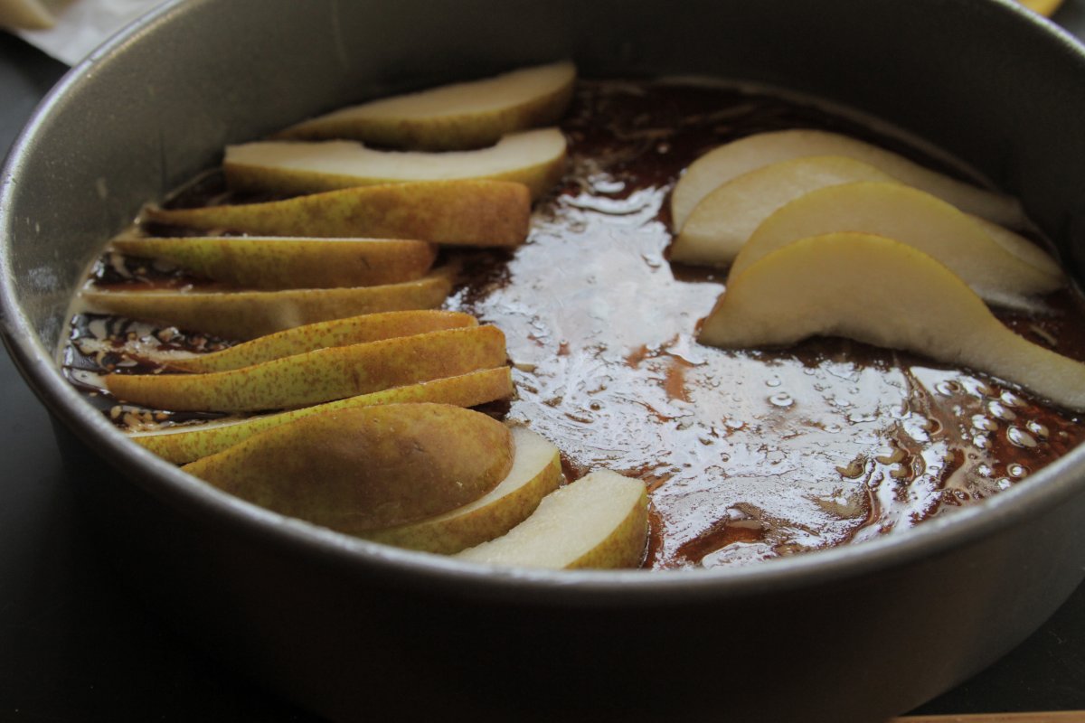 Upside-down Pear Chocolate Cake – adapted, barely, from