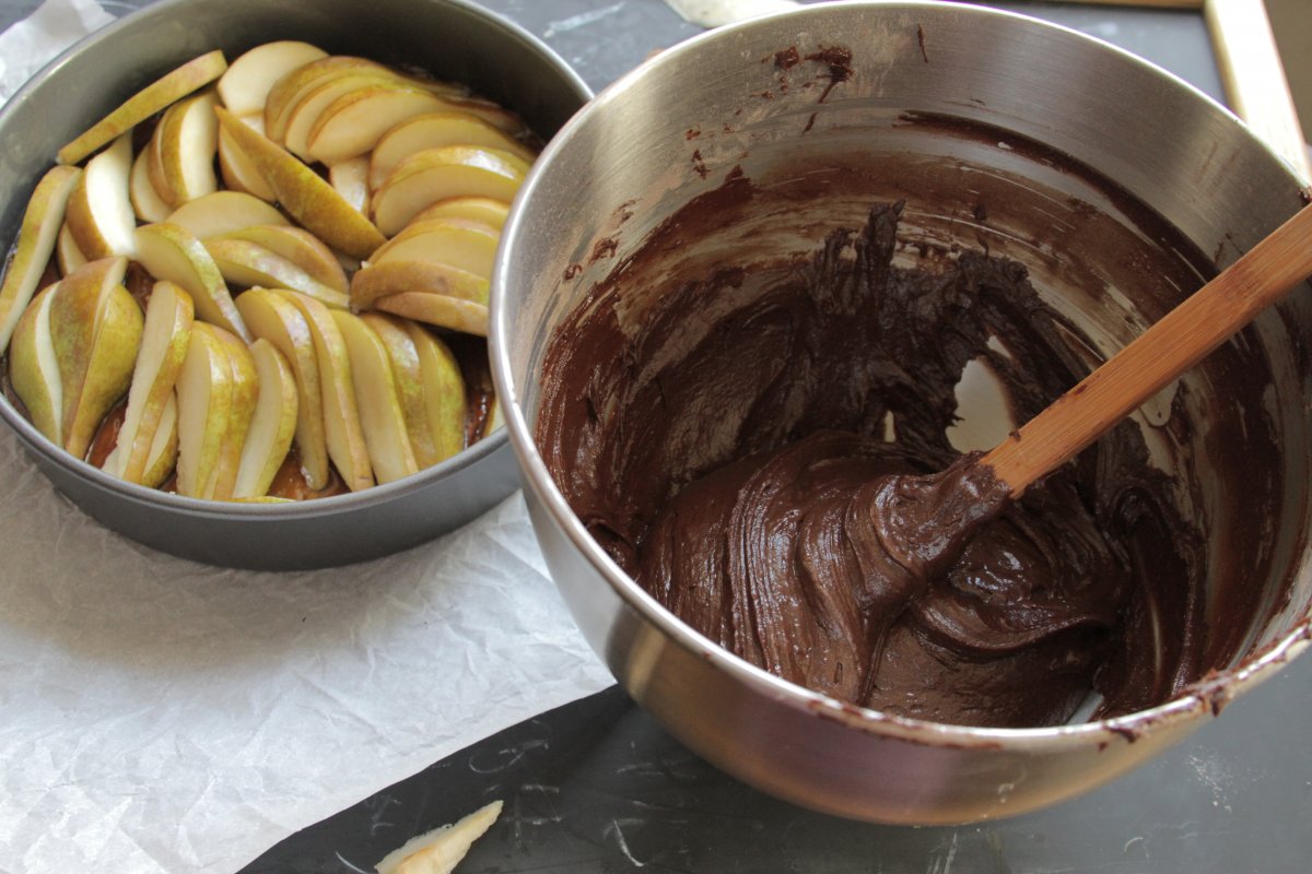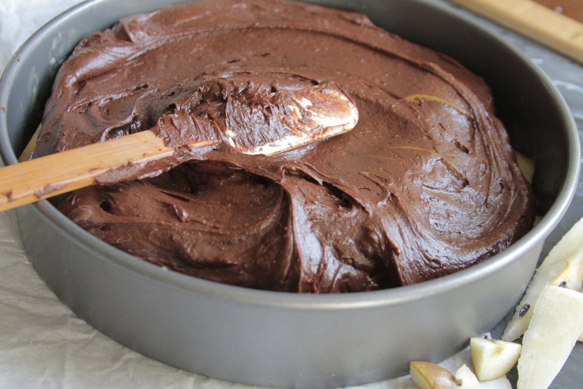 This here is chocolate cake decked out to the max with soft sweet pears and a seductive caramel lid: let’s do this!